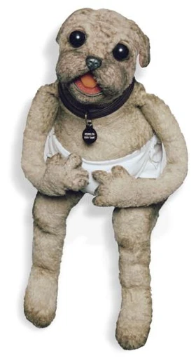 Working off of a design by Buescher for a diaper-clad Pug, Jane Gootnick found a Dog City extra in storage and mended and re-dressed it for the role. The puppet itself had also previously been used as Pavlov the Pug Dog in The Animal Show. Jim Formanek (of the Jim Henson Company) named the pooch after seeing Julianne's first character drawing.[1]